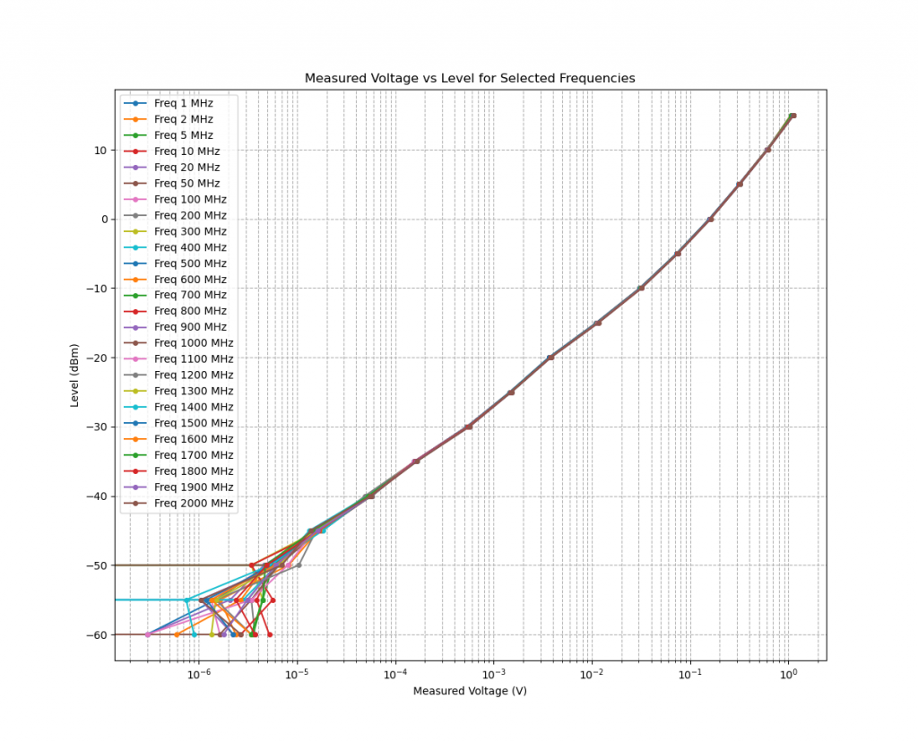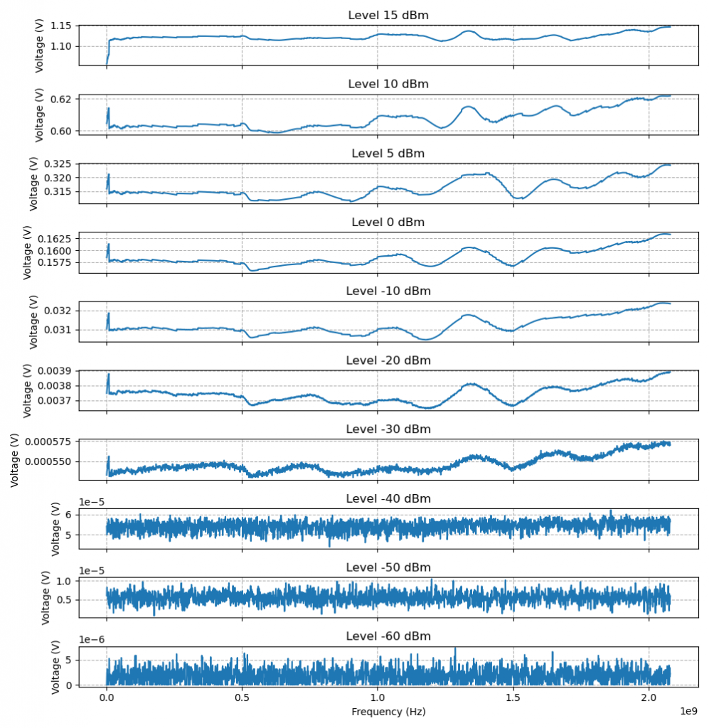 The next diagram shows the frequency dependency of the RF detector voltage at selected power levels:
