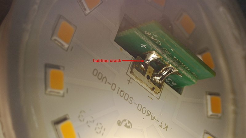 I bought a new one (actually, I bought two new LED bulbs because this type is no longer available and because I need identical bulbs for my light fixture) and replaced it. Out of curiosity, I removed the frosted, transparent, hemispherical diffuser, which was destroyed in the process. But shortly after, I saw the problem with my magnifying glass: one of the two solder joints connecting the control board to the LED board had a hairline crack, see photo.